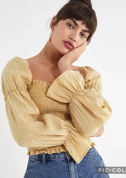 Urban Outfitters Gingham Cinched Sleeve Mustard Yellow Smocked Top ~ shade is like a buttercup/mus... Show more