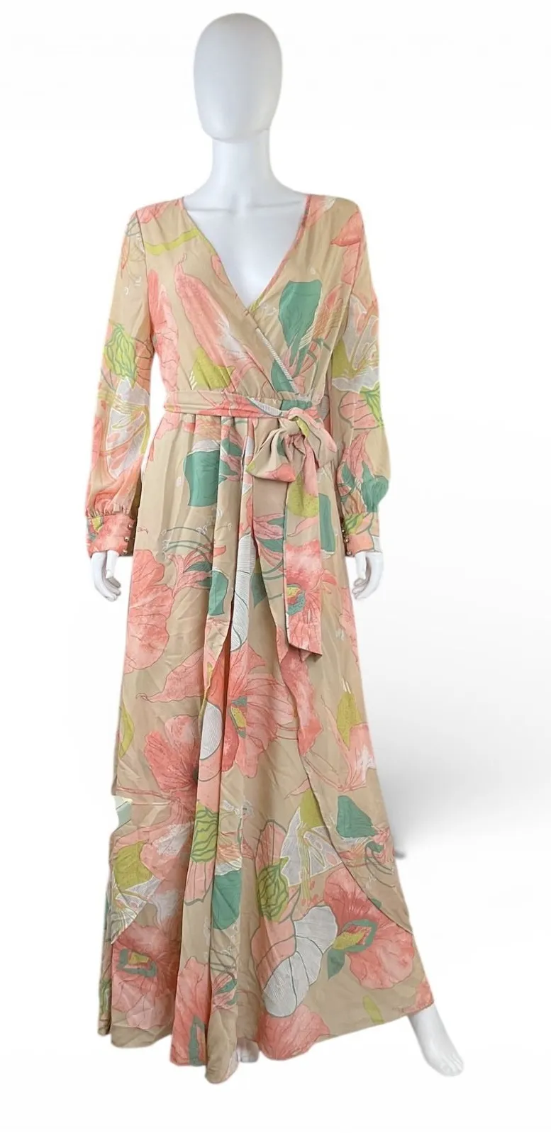 A flowing floral print maxi wrap dress by Xtaren. This elegant dress features a flattering V-neckline, long balloon sleeves with button cuffs, and a tie belt to cinch the waist. The beautiful botanical print in shades of beige, pink, and green creates a vibrant and feminine look. Perfect for a garden party, a vacation getaway, or a stylish brunch. Measurements: • Bust: 17 in • Length: 56 in Style: Maxi, Wrap Dress Dress Length: Long Department: Women Sleeve Length: Long Sleeve Pattern: Floral Occasion: Casual, Party/Cocktail Material: Polyester Fabric Type: Chiffon Theme: Colorful Neckline: V-Neck Season: Spring, Summer Sleeve Type: Long Sleeve Closure: Tie Accents: Button Features: Belted, Ruched Keywords: maxi dress, wrap dress, floral print, bohemian, feminine, garden party, vacation, brunch, long sleeve, belted, botanical print, resortwear, lightweight