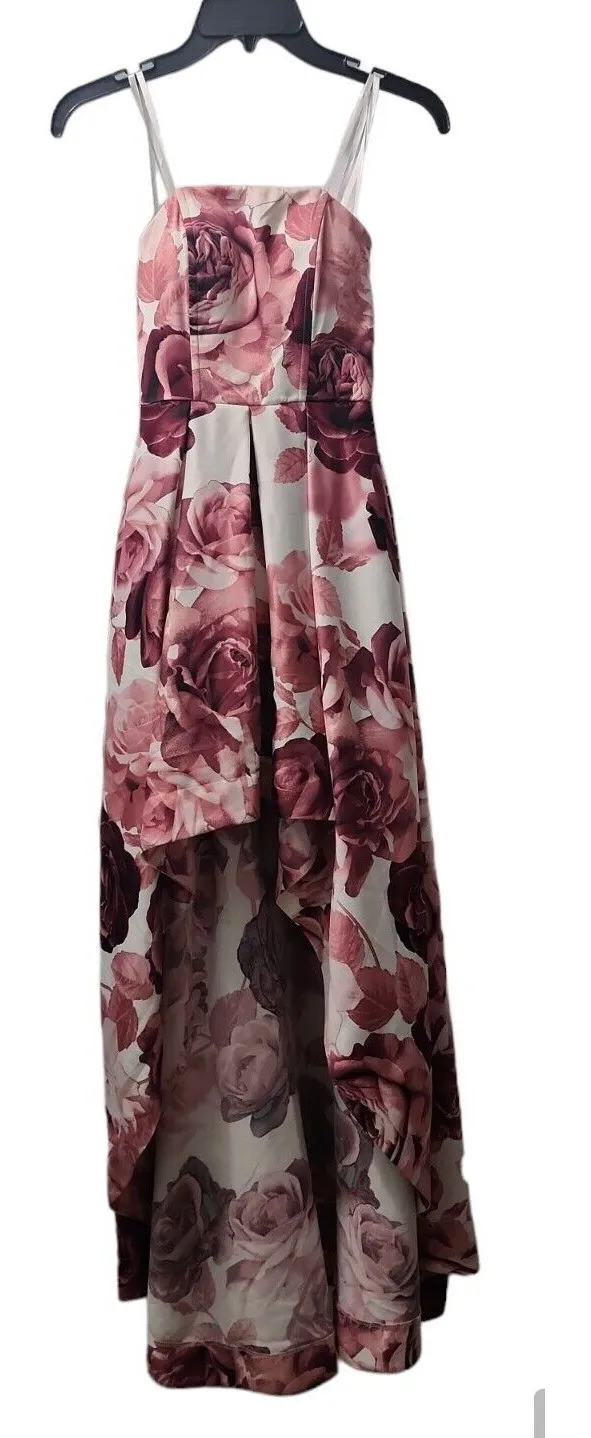A charming floral high-low dress, perfect for making a statement at any special occasion. This strapless dress features a flattering high-low hemline that adds a touch of modern elegance, while the vibrant floral print in shades of pink and burgundy creates a romantic and eye-catching look. The dress is fully lined and has a fitted bodice that accentuates the figure. Ideal for cocktail parties, weddings, or a night out, this dress is sure to turn heads and make you feel confident and stylish. Keywords: floral dress, high low dress, strapless dress, party dress, cocktail dress, formal dress, wedding guest dress, pink floral dress, burgundy floral dress, occasion dress, aline dress, sleeveless dress