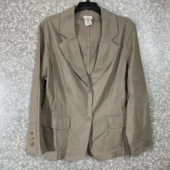 Women's plus size boho career blazer by White Stag. This beige jacket has a subtle floral jacquard pattern, two button closure, and front patch pockets. It is a cotton spandex blend. The blazer is a size 18W/20W. When laying flat it measures approximately: Armpit to armpit: 26 inches Length: 29 inches The blazer is in amazing shape.