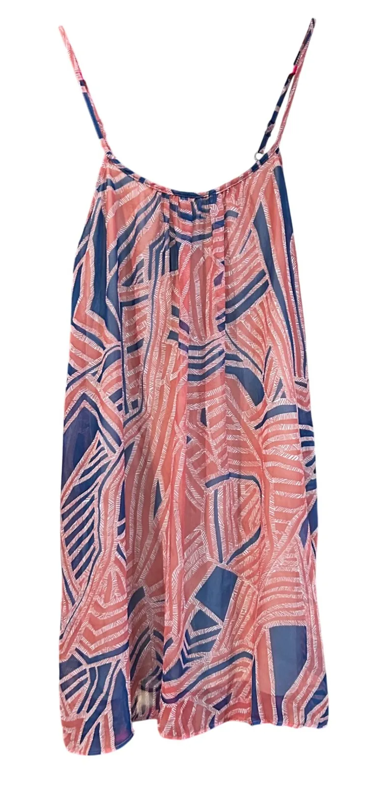 Like new! True to size with plenty of flowy room. And stretch! Flowing sleeveless dress, a stylish choice for warm weather or layering. Showcasing a dynamic coral and blue geometric print, this dress features a sheer, lightweight construction that ensures comfort and breathability. The gathered neckline adds a touch of delicate detailing, while the relaxed fit allows for ease of movement. Perfect as a beach cover-up, a casual day out, or a stylish layering piece for summer festivals.