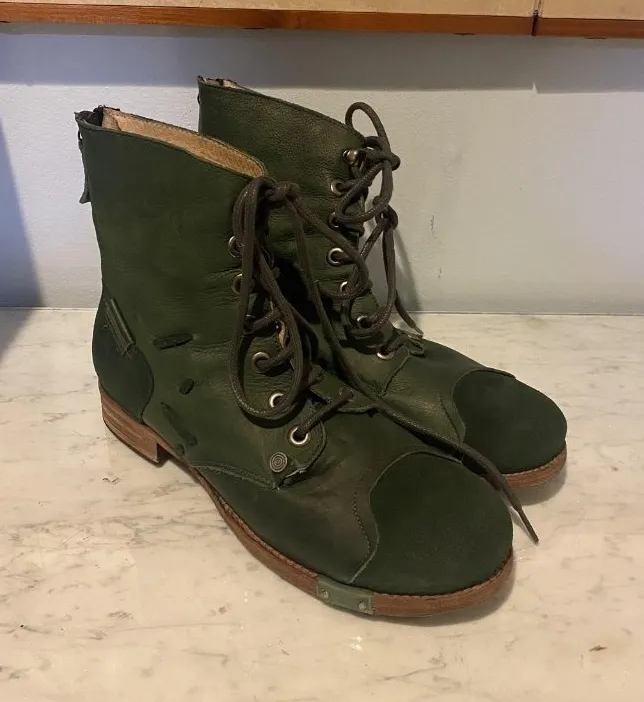 Brand: Unknown (no clear brand name visible on insole or sole). Item: Womens lace up ankle boots with rear zipper entry and round toe. Color: Dark forest green with mixed smooth leather and suede panel construction and brown stacked low heel. Size on sole: EU 39 (approximately Womens US Size 8). Details: Front laces with metal eyelets, back zip closure, leather outsole with rubber heel cap, stitched welt style, lightly distressed finish and casual combat-inspired look.