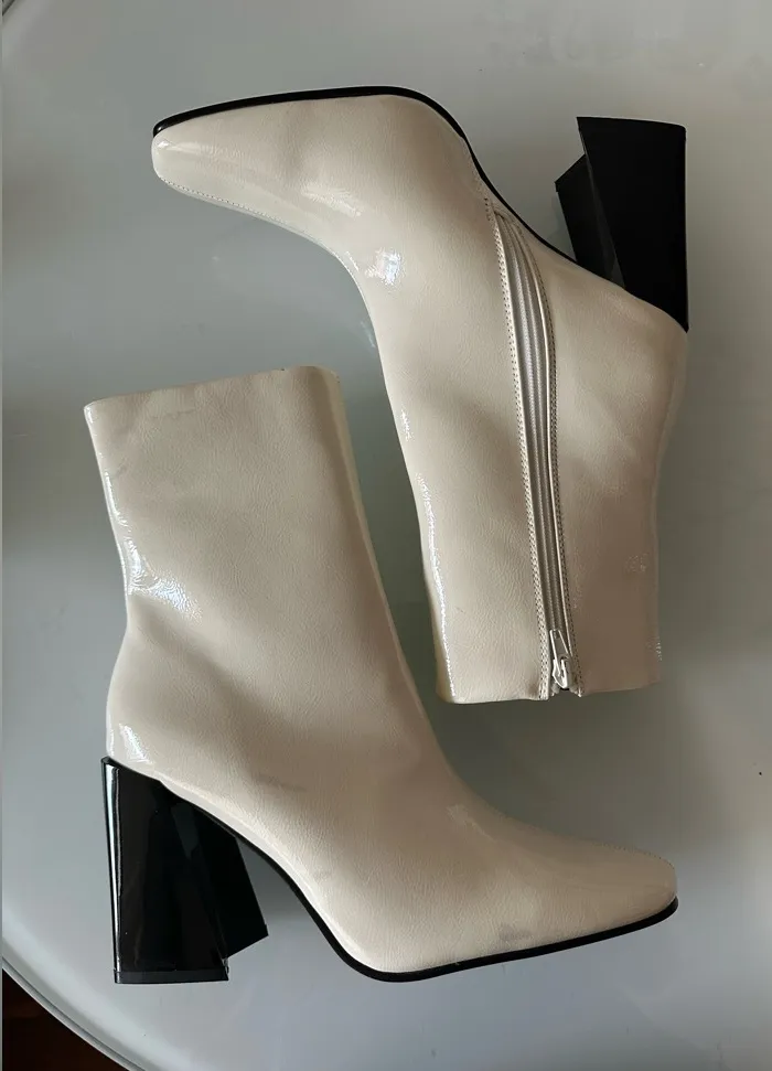 Chic cream boots with bold black heels. Sleek design with side zipper. Perfect for stylish outings.
