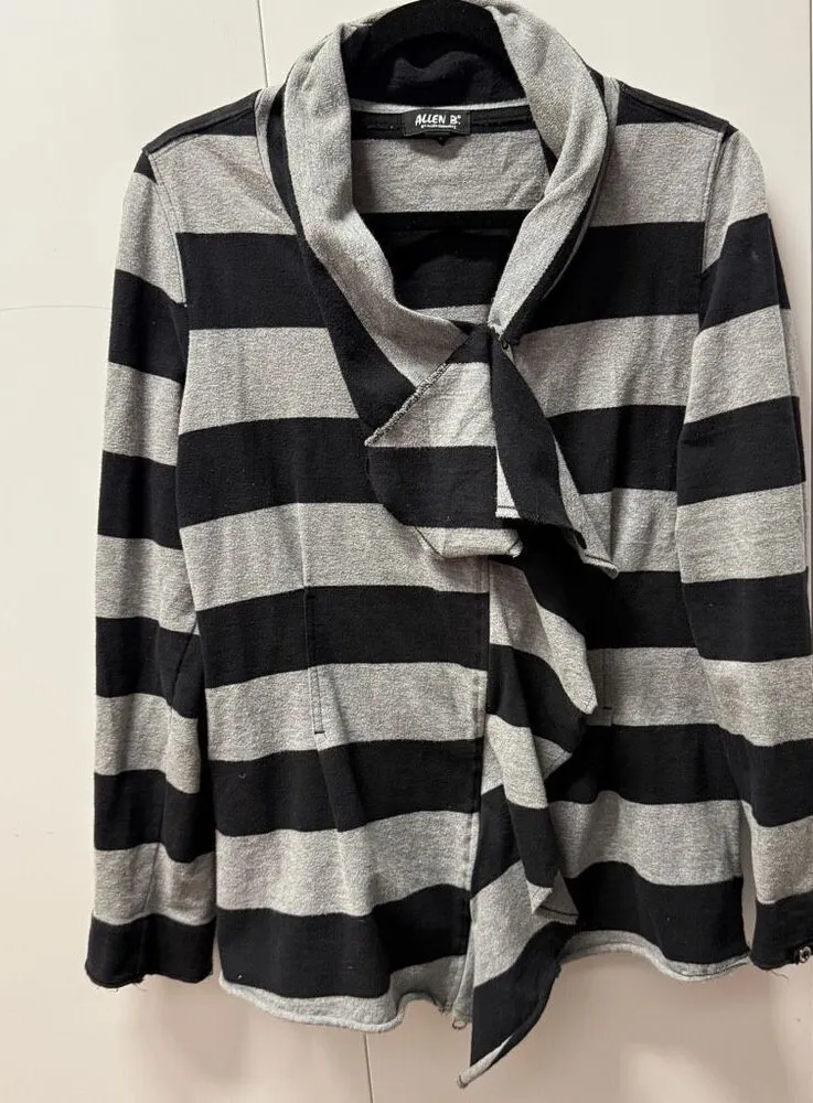 Y2K Allen B Allen Schwartz Women's Drapes Ruffle Front Cardigan Size Large Grey & Black Stripes Zi... Show more