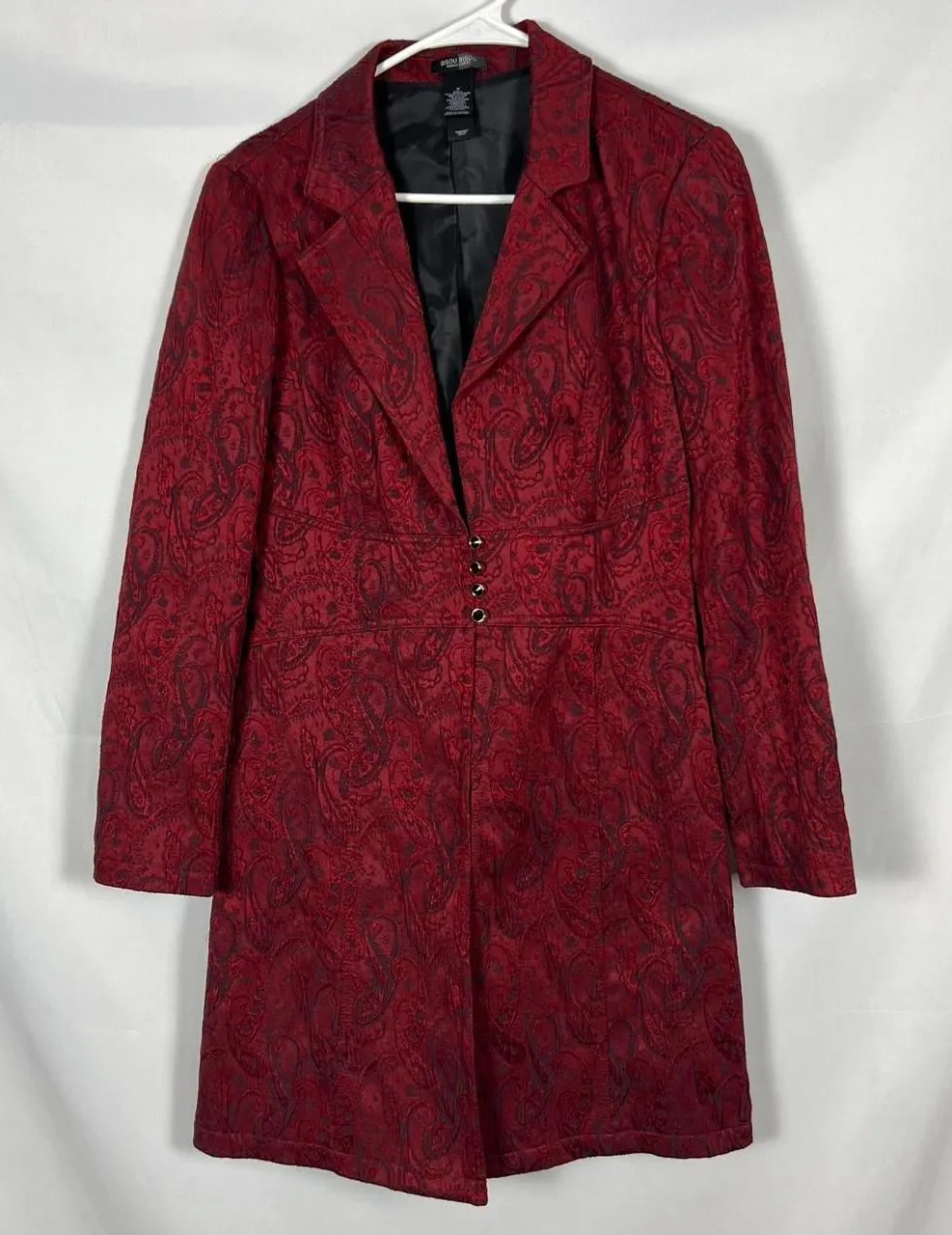 Y2K Bisou Bisou Red & Black Paisley Jacquard Longline Coat Channel your Y2K drama with this vintage-inspired longline jacket by Bisou Bisou. The deep red and black paisley jacquard fabric provides a rich, textured look that perfectly captures an old school Goth vibe. It features structured tailoring with flattering princess seams, a notched collar, and decorative gold-rimmed buttons over a hidden hook-and-eye closure. This striking coat is fully lined and instantly adds sophistication and edge to any outfit. Details: • Brand: Bisou Bisou by Michele Bohbot • Size: 10 • Color: Red and Black Paisley • Material: Shell - 60% Cotton, 39% Polyester, 1% Spandex. Lining-100% Polyester • Features: Longline jacket/coat, structured fit, black paisley jacquard, hidden hook and eye closure. • Condition: Excellent pre-owned condition. Measurements (Laying Flat): • Pit to Pit: 17.5” • Waist: 15.5” • Length: 35.5” • Sleeve: 23.5” #goth #y2k #paisley #bisoubisou #vintage