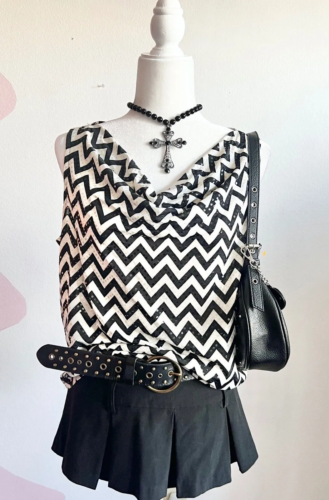 Y2K Black & White Chevron Tank Top, Sequins, Retro Glam, Indie Sleaze, Bold, M‎ Size M - $12 - From Kenia