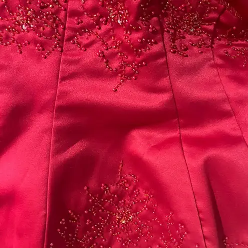 Step into the spotlight with this stunning, authentic Blondie Nites by Stacy Sklar evening gown. This dress is the epitome of Y2K formal glamour, featuring a rich ruby red satin that catches the light beautifully. Whether you’re looking for the perfect vintage prom look, a military ball gown, or a dramatic formal statement piece, this dress delivers. Design Details: • Style Number: 50124J • Bodice: Strapless sweetheart neckline with intricate tonal beadwork and shimmering sequins. • Waistline: Flattering dropped Basque waist (V-shape) that elongates the torso. • Skirt: Dramatic "pick-up" style skirt with a voluminous, tucked silhouette and floor-length hem. • Fabric: High-shine, structured satin with a luxurious weight. • Closure: Secure zipper back. Great Vintage Condition. This dress has been well-cared for. There are minor, faint flaws on the satin skirt (small surface scuffs/snags typical of satin fabric). These are barely visible when worn due to the deep red color and the natural folds and volume of the pick-up style skirt. Please see photos for close-ups. BlondieNites, Y2KProm, VintageGown, RedSatinDress, PickUpSkirt, StacySklar, FormalWear, Prom2026, Coquette, BallGown
