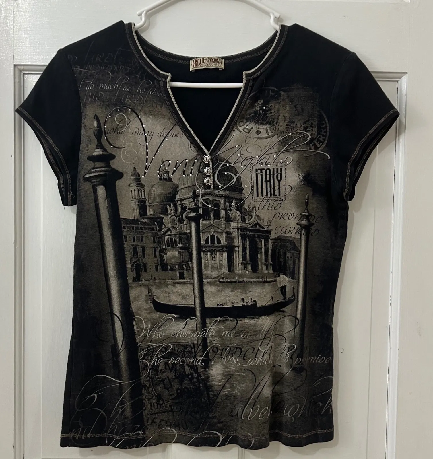 Type: T-Shirt Department: Women Style: Basic Material: Cotton Blend Neckline: V-Neck Sleeve Length: Short Sleeve Sleeve Type: Classic/Fitted Sleeve Pattern: Graphic Accents: Button, Rhinestone, Stitching Theme: Art, Travel, Italy, Y2K, Dark Romantic Features: Buttons, Stretch, FItted Fit: Slim Fabric Type: Jersey Occasion: Casual Closure: Pullover Keywords: Venice, Italy, graphic tee, henley, short sleeve, travel, European, embellished, script, vintage inspired, casual wear, comfortable, Y2K Pit to pit: 21" length from shoulder: 23"