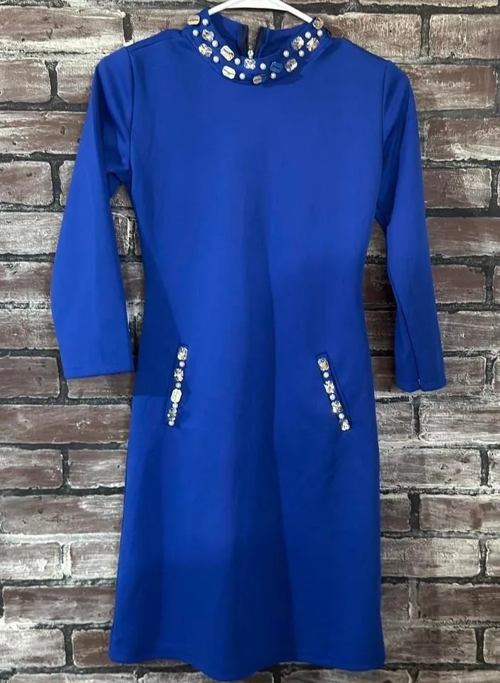 Bold Y2K mini dress in a vibrant royal blue with rhinestone and pearl embellishments. Features a structured mock neckline, 3/4 sleeves, and decorative gem detailing at the neckline and pocket accents. Stretchy fabric with a flattering fitted silhouette. Perfect for Y2K, party, club, or statement looks. No holes or stains noted. Loose threading visible shown in photos. Please reference measurements for best fit. • Style: Y2K, Party, Clubwear • Color: Blue • Length: Mini • Sleeves: 3/4 length • Neckline: Mock neck • Closure: Back zipper #y2kdress #partymini #clubwear #embellisheddress #statementdress