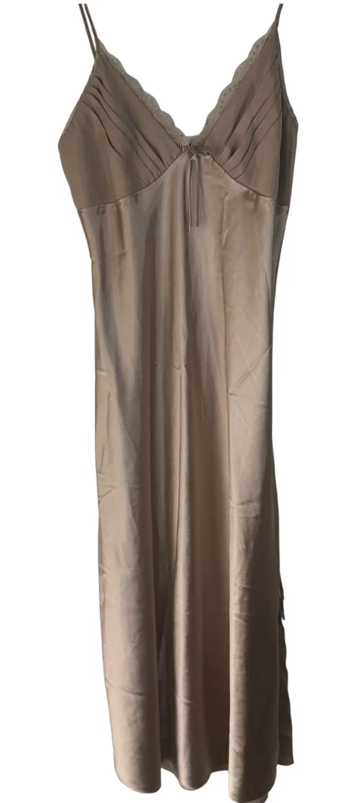 Y2k Champagne Satin Slip Dress Lace Trim Midi Party Going Out Small Style: Slip Dress Dress Length: Midi Color: Beige Department: Women Sleeve Length: Sleeveless Pattern: Solid Occasion: Party/Cocktail, Formal Material: Polyester, Polyester Blend Neckline: V-Neck Character: Elegant, Feminine, Sophisticated, Classic, Chic Fabric Type: Satin Season: Spring, Summer, Fall Keywords: satin slip dress, midi dress, champagne dress, lace trim dress, party dress, cocktail dress, evening dress, elegant dress, sleeveless dress, formal dress, bridesmaid dress