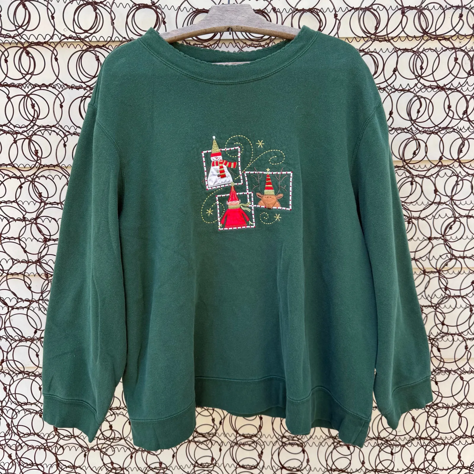 Y2K Christmas Embroidered Crewneck Sweatshirt Snowman Elf Reindeer Santa forest green adorable cartoony snowman, reindeer, and Santa/elf embroidered on front chest Brand Holiday Editions Scalloped edge neckline crewneck 80% Cotton 20% Polyester Womens size 3X good preowned condition, minor pilling measurements in photos
