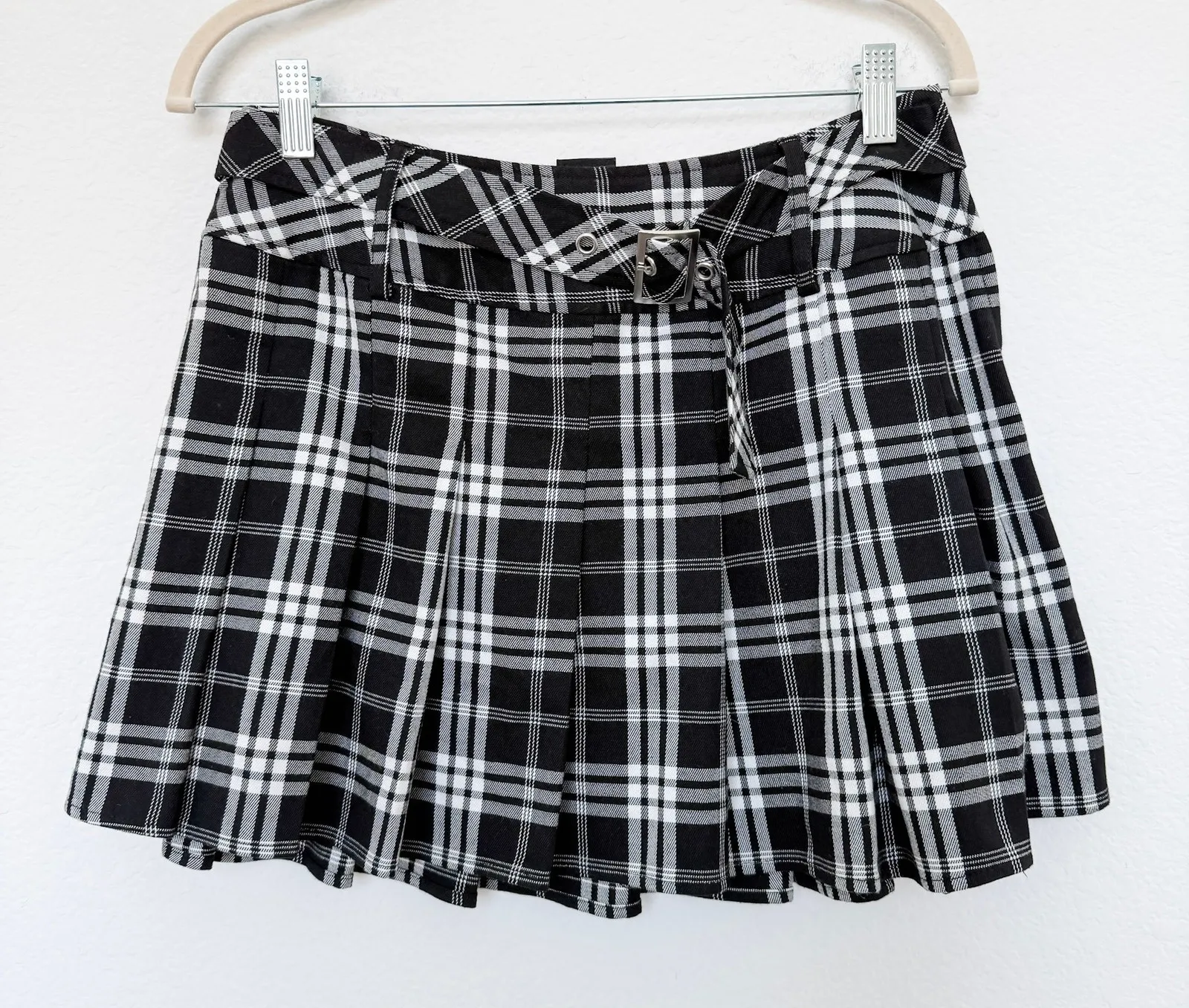• Black and white plaid print with pleated mini silhouette • Built-in belt detail with silver-tone buckle accent • Soft polyester-blend fabric with slight stretch • Perfect Y2K grunge or punk-inspired piece — pairs with fishnets, boots, or crop tops Condition: Excellent pre-owned condition. No visible flaws. See photos for details. Keywords: Y2K, grunge, punk, goth, e-girl, schoolgirl, plaid, mini skirt, alt, streetwear, edgy, academia, plaid Check photos for measurements. Ships next day Bundle deals available