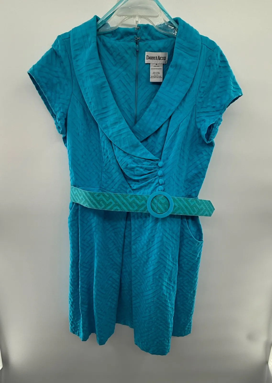 Vibrant Danny & Nicole women's dress in size 16 with bold mid-century charm. Features a striking turquoise geometric textured cotton fabric, pleated bodice with covered buttons, short sleeves, and a matching belt with round buckle. Hidden back zip and structured shape create a true 1960s mod silhouette with timeless retro appeal. Perfect for vintage lovers, pin-up fashion, retro parties, Mad Men fans, or spring and summer events. This dress pairs beautifully with kitten heels or statement jewelry for a chic nostalgic look. Pit to pit 23 in Waist 17.5in Length 40in Excellent pre-owned condition with no flaws. Danny & Nicole dress, teal dress, size 18 dress, belted dress, geometric print dress, textured dress, short sleeve dress, women's dress, plus size dress, casual dress, summer dress, work dress, party dress