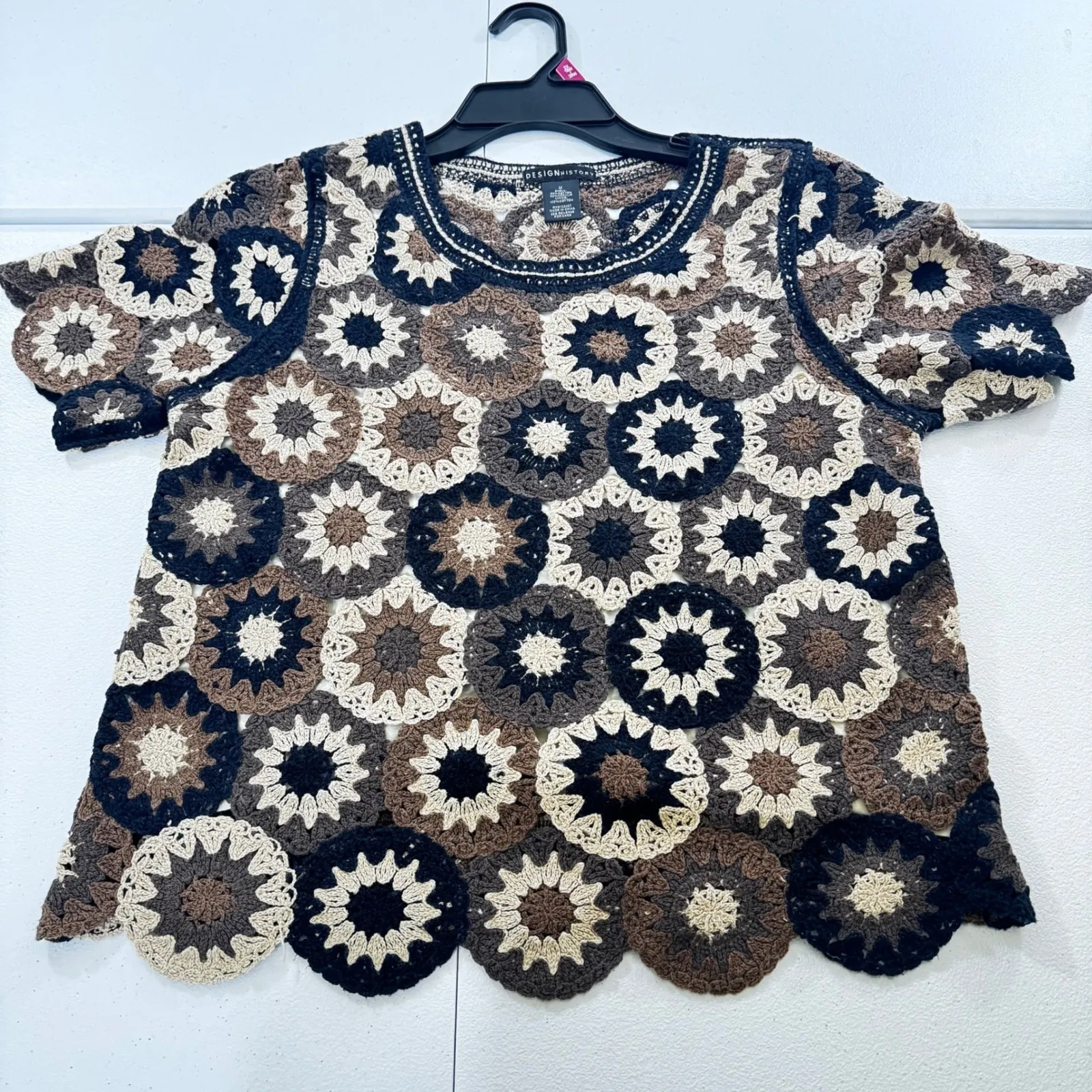 Embrace bohemian charm with this exquisite DESIGN HISTORY crochet tunic. Handcrafted with intricate floral motifs, this piece offers a unique texture that's both visually captivating and delightfully tactile. The rich blend of earthy browns, deep blacks, and creamy ivories creates a stunning, sunburst-like pattern that dances across the garment. Its open knit construction, finished with a delicate scalloped hem and a contrasting neckline, adds a touch of artisanal elegance. Perfect for layering over a camisole for a casual day out, as a stylish beach cover-up, or for adding a unique flair to an evening ensemble. Measurements: • Pit to Pit: 19 inches • Length: 25 inches Type: T-Shirt Department: Women Style: Tunic Material: Cotton Blend, Acrylic, Cotton Neckline: Round Neck Sleeve Length: Short Sleeve great preowned condition Sleeve Type: Cap Sleeve Pattern: Floral Accents: Crochet Theme: Bohemian, Designer Features: Contrasting Trim, Unlined Fit: Relaxed Keywords: DESIGN HISTORY tunic, crochet top, floral crochet shirt, bohemian style top, women's tunic, designer knitwear, brown black cream shirt, short sleeve crochet, festival clothing, summer top, unique textured top, artisanal clothing, scalloped hem tunic