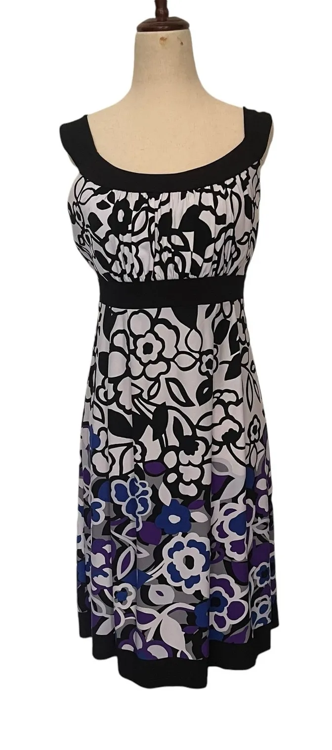 Enfocus Studioblue Y2K Babydoll Floral Print Midi Dress with Round Neck and Back Tie Indie Sleaze Retro Trimmed in black, purple and royal colored in on bottom of skirt floral print Padding in bust, stretchy material, pullover Good pre-owned condition, please see photos Size 14 95% Polyester 5% Spandex Lining 100% Polyester Approximate measurements in inches: Pit to pit: 17 Shoulder to hem: 36 retro floral, office to evening, cocktail dress, monochrome print, back tie, feminine silhouette, vintage-inspired, workwear chic, wedding guest, garden party, Y2K, indie sleaze, retro floral, empire waist, early 2000s, coquette, feminine, romantic, fit and flare, sleeveless dress, scoop neck, black and white dress, purple floral, midi dress, summer dress, festival, date night, Enfocus Studio, throwback fashion