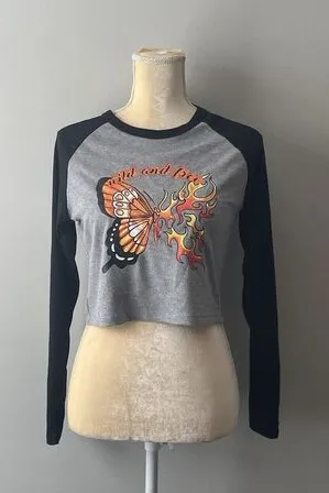 Elevate your casual look with this Y2K inspired Faded Rose Wild Free Butterfly Graphic Crop T Shirt. Featuring a round neckline and long sleeves, this shirt is perfect for any casual occasion or travel adventure. The lightweight, breathable fabric is a blend of polyester, spandex, and rayon, making it easy to care for and packable for your convenience. The shirt is adorned with a beautiful butterfly and flame pattern, adding a touch of flirty, sexy appeal to your outfit. The collarless design, casual sleeve type, and contrasting trim make this shirt perfect for any Y2K, lounge, or club theme. Available in size L, this regular fit shirt is machine washable and offers a comfortable, stretchy fit.