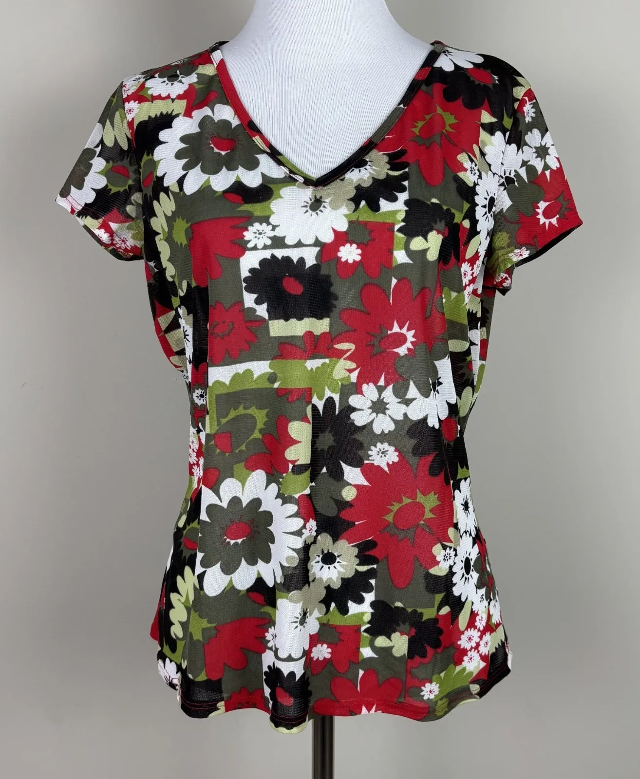 Very good condition! Measurements are in the photos. Fabric content and washing / care information in photos - see tag photos. Pullover See through Green, red, white, black flower pattern All preowned items have been cleaned. Stored in a smoke and pet free home. Thanks for looking!