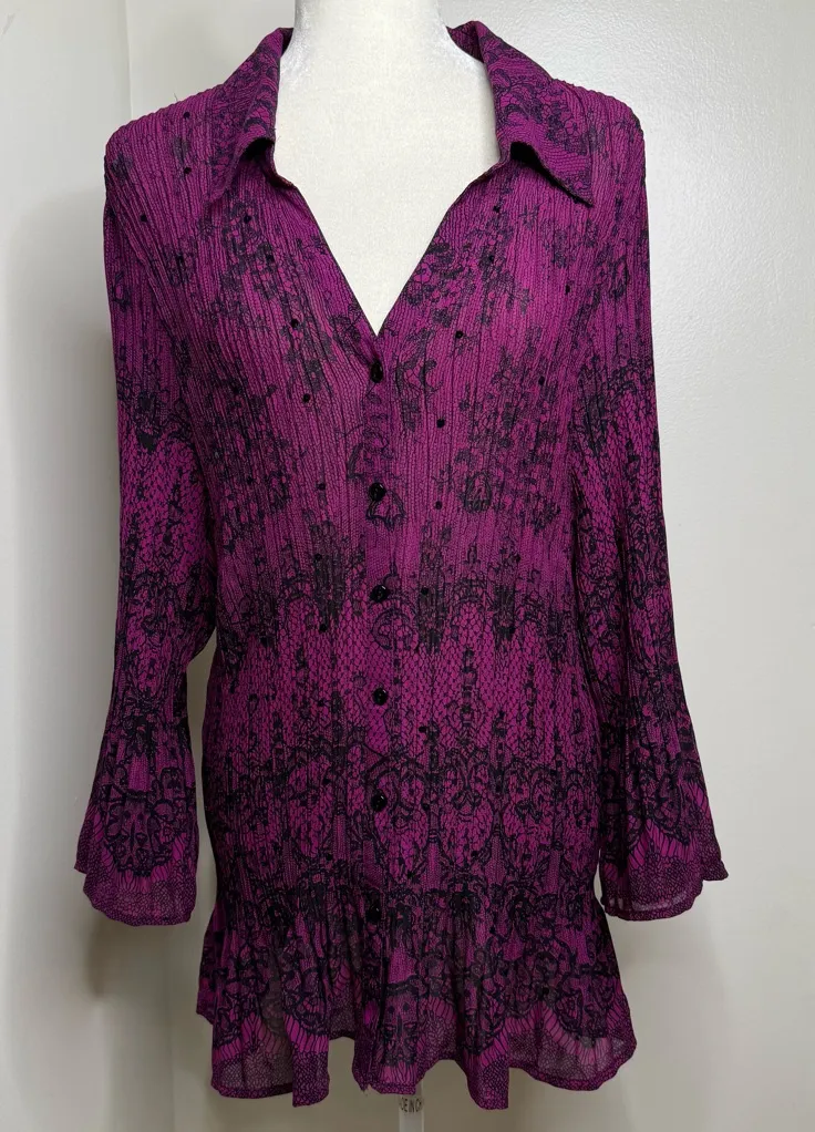 Due to the nature of the stretch fabric this measures like a large but does have stretch but may still be small for a 4x Would make a really cute mini dress. Shown on my size small to medium dress form. Thin semi sheer material Has some loose strings that need to be cut off