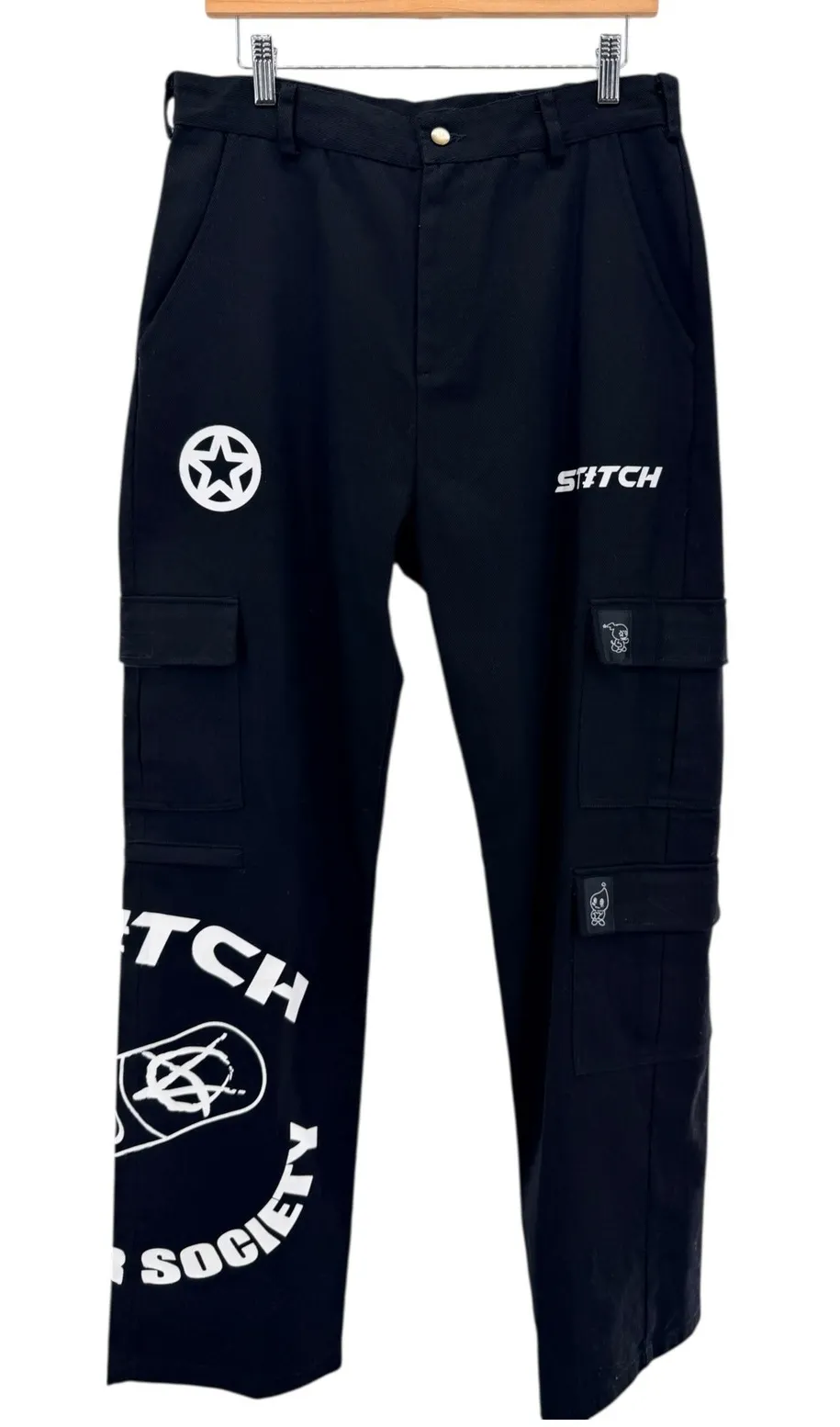 Step into bold Y2K-inspired streetwear with these standout graphic cargo pants. Designed with a structured utility silhouette and eye-catching graphics throughout, these pants deliver serious alt / anime / skater energy. A perfect statement piece for streetwear lovers, festival fits, or underground fashion fans. Black graphic cargo pants with multiple utility cargo pockets Bold screen-printed graphics including skull, lightning cloud, star insignia & text Straight to relaxed leg fit Button closure with belt loops Durable mid-weight cotton twill construction Strong Y2K revival / alt streetwear aesthetic Fabric & Care 100% Cotton Cold machine wash separately Line dry in shade Do not bleach or tumble dry Measurements (laid flat, approx.) Waist: 32" Rise: 13" Inseam: 30" Please compare measurements to a similar garment you own for best fit. Y2K • Alt Streetwear • Anime Core • Skater • Goth • Rave • Utility • Cyber • Graphic Cargo Pants • Underground Fashion Very good pre-owned condition. Graphics remain bold and intact with no major flaws noted. Please review all photos for full condition details. Keywords: streetwear, graphic pants, skater, alt fashion, goth, punk, urban, designer, casual, unique, statement pants, designer pants