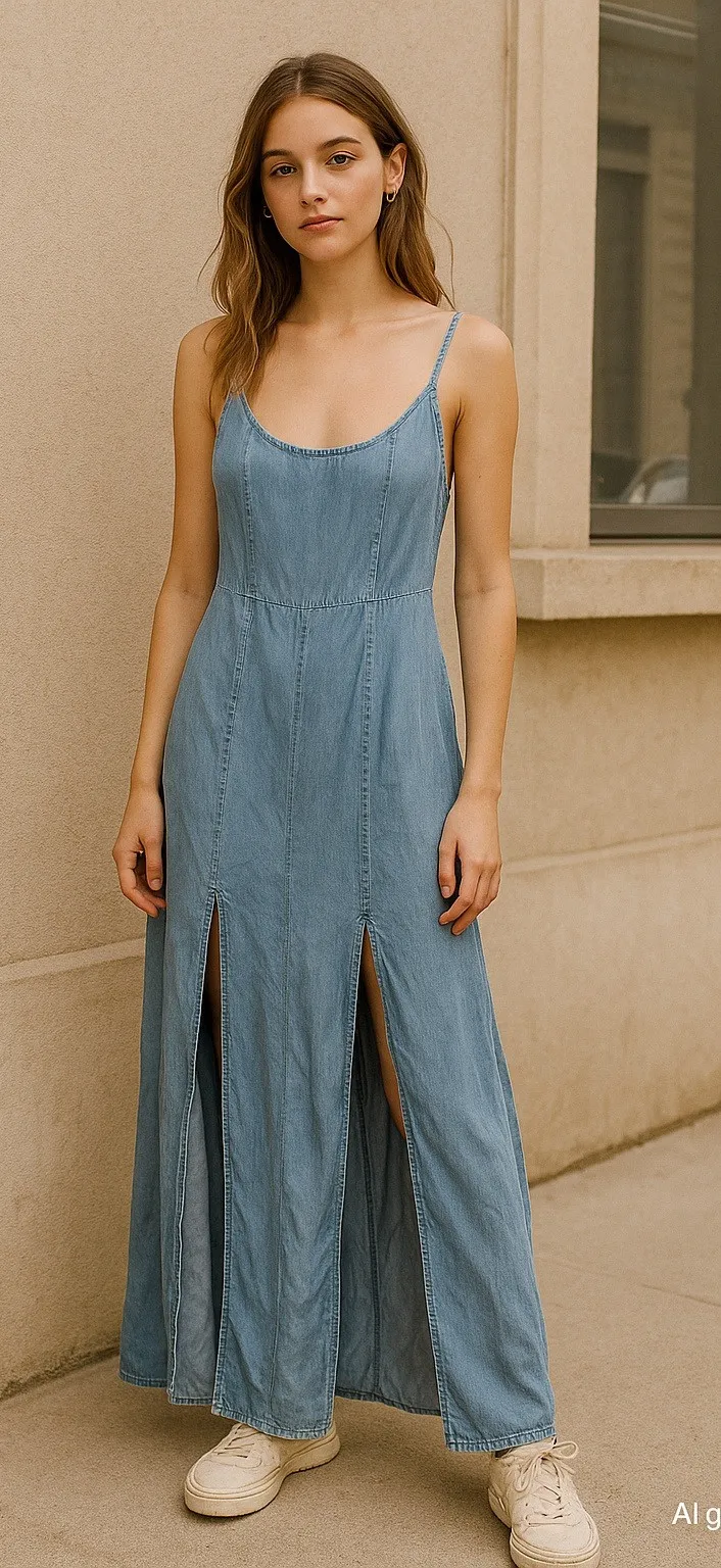 Light blue denim-look slip dress by Guess Los Angeles 100% lyocell fabric — soft, breathable, and dr... Show more
