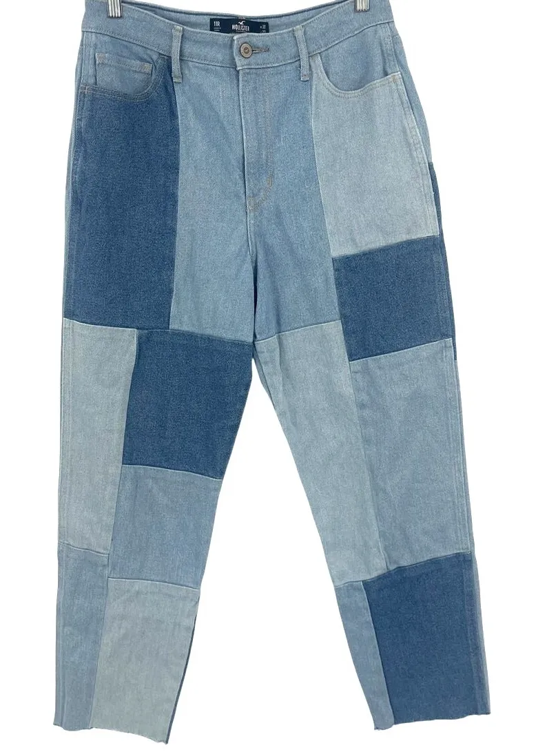 Hollister Patchwork Mom Jeans Ultra High Rise Y2K Indie Raw Hem 5 pocket, button and zipper closure.... Show more