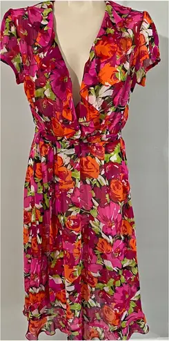 This vibrant floral feminine dress features bold pink and orange blooms with a flattering ruffle tri... Show more