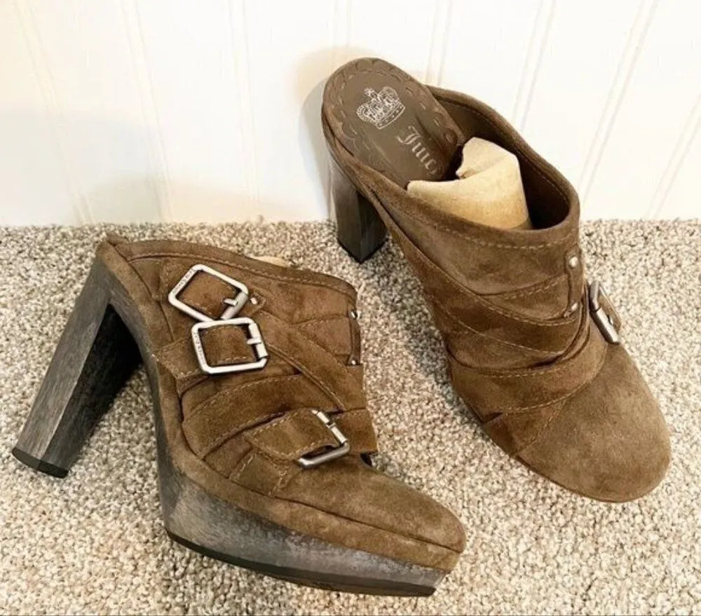 Juicy Couture Collette Suede Slip On Wood Mules Platform Shoes Buckle Y2K Size 8 The suede upper fe... Show more