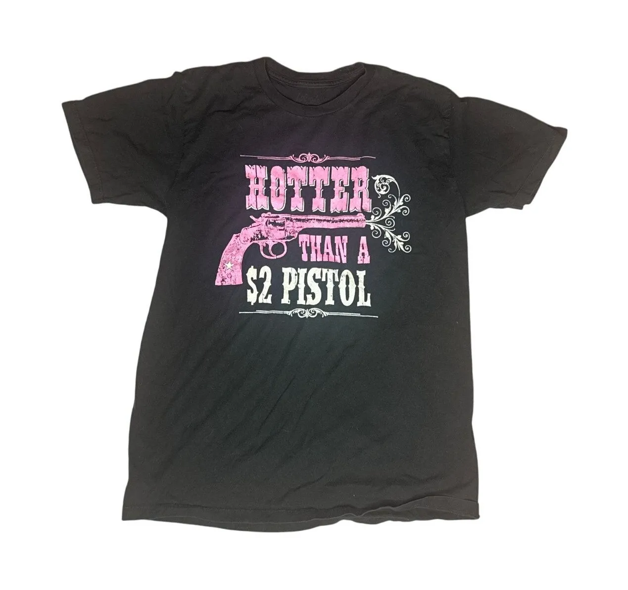 Early 2000s Lifestyle Classics graphic tee with the bold phrase “Hotter than a $2 pistol” in pink and white lettering across a black shirt. True vintage Y2K truck stop style with that perfect early-2000s attitude. Measures 34” around the chest and 25” in length, fitting like a women’s size Small. Soft cotton blend fabric with a fitted silhouette — perfect for pairing with low-rise jeans, boots, or layering under a denim jacket for that classic retro look.