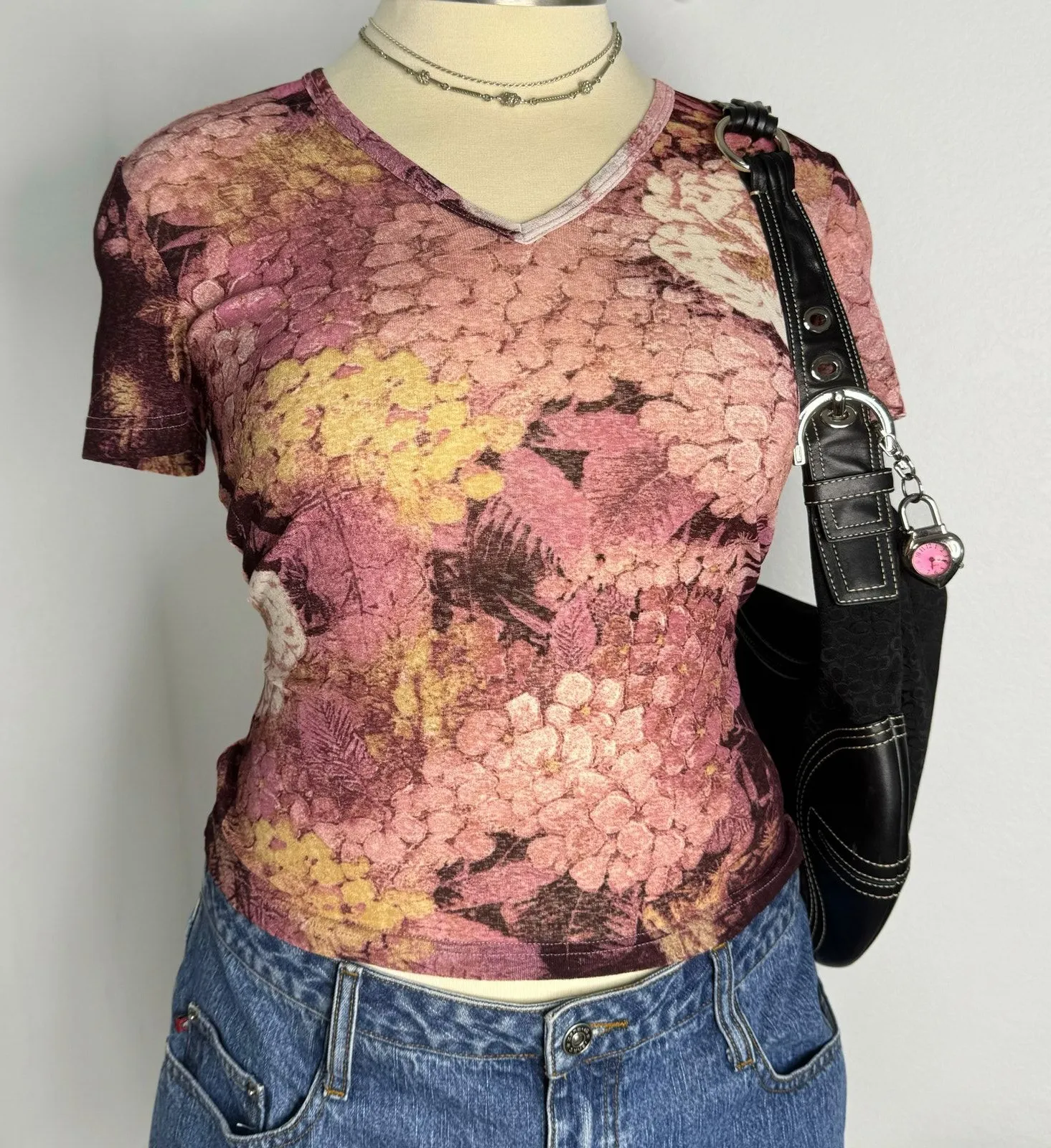 Y2k Mesh Sheer Baby Tee T-Shirt Floral V-Neck Large Karen Kane - $26 - From Emily
