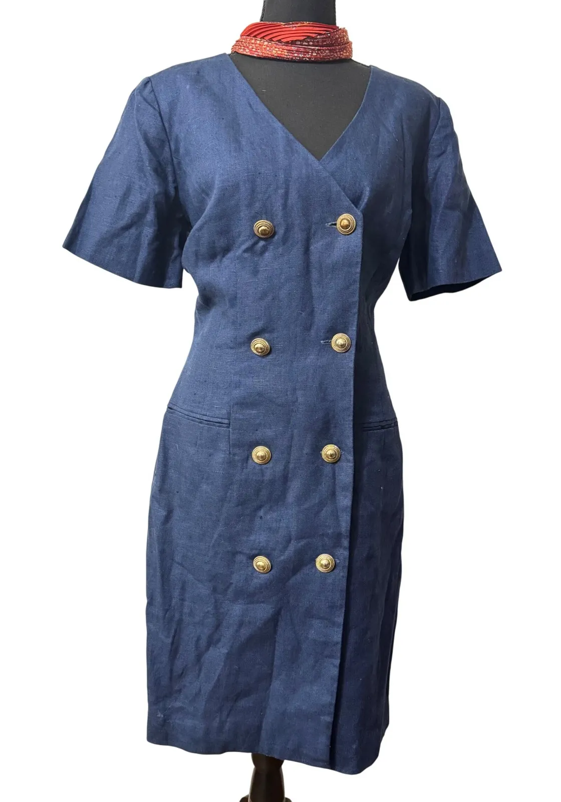 Channel sophisticated power dressing with this striking navy linen sheath dress from NY Sake. The double-breasted silhouette with gleaming gold-tone buttons creates a polished and commanding look, while the V-neckline and short sleeves offer a touch of modern elegance. Crafted from breathable linen, this dress promises both comfort and impeccable style. Perfect for a crucial business meeting or a stylish luncheon. Measurements: • Bust: 38 in • Waist: 34 in • Hips: 40 in • Length: 38 in • Shoulder to Shoulder: 15 in • Sleeve Length: 7 in Style: Sheath, Jacket Dress Dress Length: Knee Length Department: Women Sleeve Length: Short Sleeve Pattern: Solid Occasion: Workwear, Business Material: 100% Linen, Rayon Fabric Type: Woven Neckline: V-Neck Season: Spring, Summer Sleeve Type: Cap Sleeve Closure: Button Accents: Button Features: Pockets, Lined Keywords: navy dress, linen dress, double breasted, sheath dress, business dress, gold buttons, v-neck, short sleeve, professional attire, tailored dress, classic style, summer dress, workwear, elegant