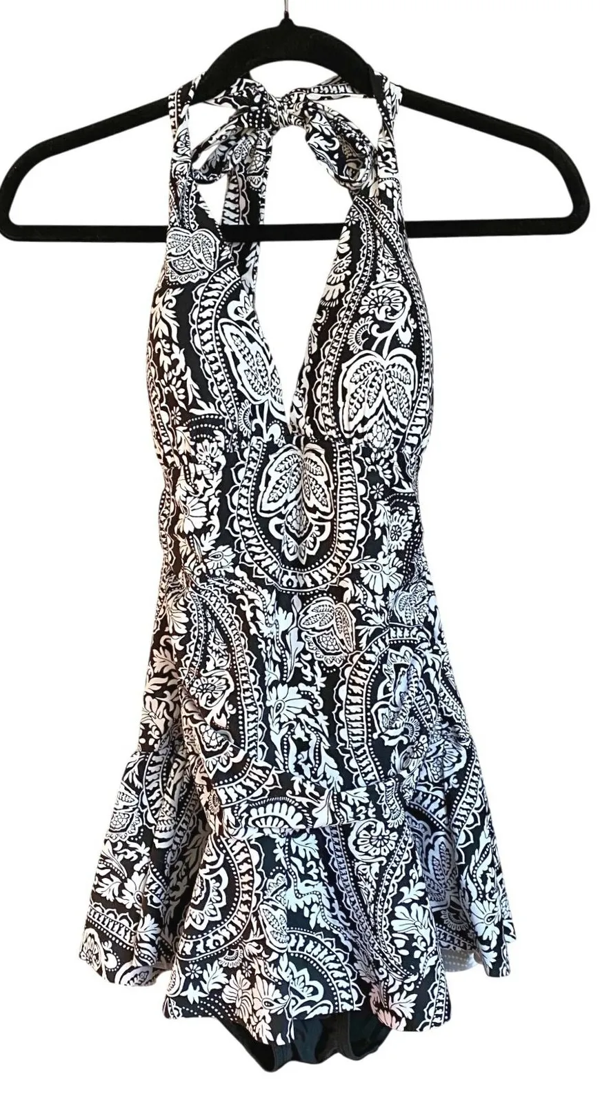 Rose Marie Reid one piece swimsuit in a black and white paisley print. This flattering halter style features a deep sweetheart V-neck and a drop waist skirted bottom for added coverage. Never worn, hygienic liner still intact. Only flaw is a small snag on the inner padding as seen in last pic. Approximate measurements: 28" length, 18" ptp Type: Swimdress Department: Women Material: Polyester, Nylon, Spandex Blend Swim Bottom Style: Swim Skirt Features: Lined, Removable Pads, Adjustable Strap, Stretch, Padded Swim Top Style: Triangle Pattern: Paisley Strap Type: Halter Number of Pieces: 1 Piece Country of Origin: Vietnam Garment Care: Hand Wash Only beach, cruise, y2k retro, babydoll, modest, siren, swim dress, Rose Marie Reid, one piece, halter, paisley, black and white, swimsuit, beachwear, poolside, resort wear, vacation, skirted, flattering, summer