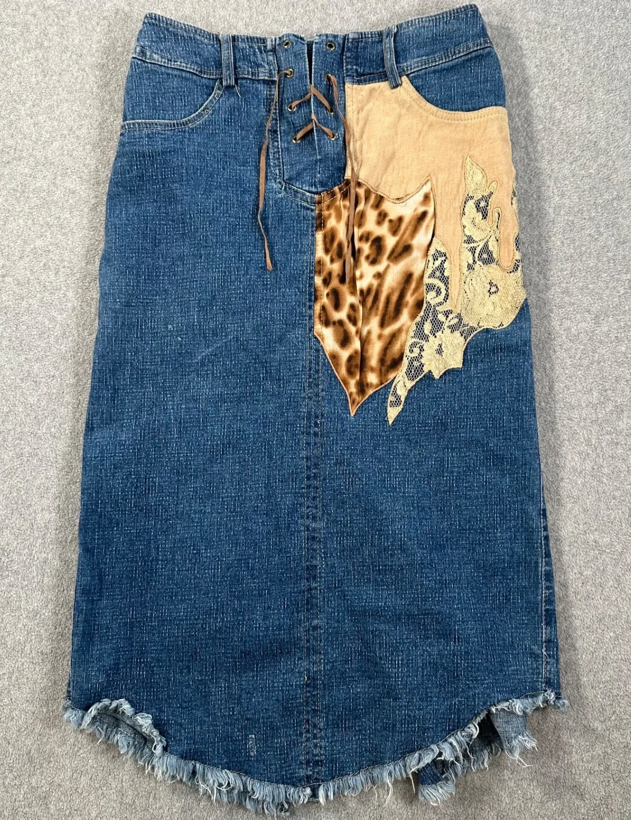 Size: No Size Tag - Waist Measures 27". Please compare measurements to a skirt you already own for best fit. Condition: No Size Tag - Very Good Pre-Owned Condition, Small imperfection near bottom hem. Please see all photos for most accurate representation of condition Color: Blue, Brown Closure: Lace Up Pockets: Pockets are Faux Material: 95% Cotton, 5% Elastane