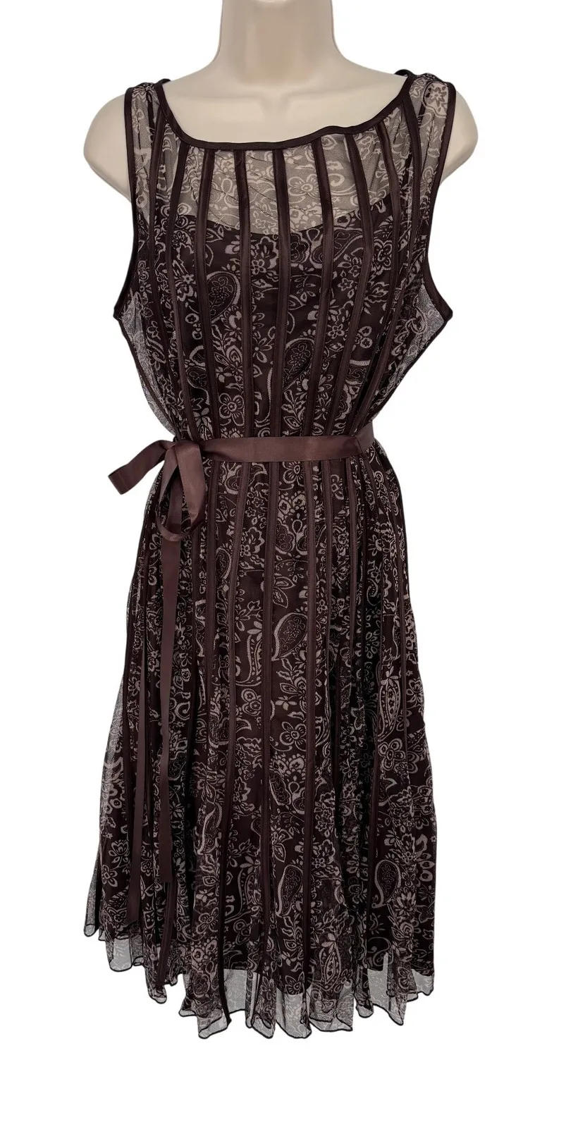 Enchanting paisley dress casts a spell of timeless elegance. A rich brown hue sets the stage for an intricate paisley pattern, creating a look that's both sophisticated and subtly bohemian. The sleeveless design and lightweight fabric promise breezy comfort, while the included ribbon cinches the waist for a flattering silhouette. A delicate lining ensures a smooth, confident fit. Perfect for garden parties, evening cocktails, or a romantic dinner date, this dress is your ticket to effortless chic. Style: A-Line Dress Length: Midi Color: Brown Department: Women Sleeve Length: Sleeveless Pattern: Paisley Occasion: Party/Cocktail, Casual Material: Polyester Neckline: Round Neck Fabric Type: Mesh Season: Spring, Summer, Fall Sleeve Type: Strapless Closure: Tie Approximate Measurements Laying Flat Across: Chest: 20 inches Waist: 17 inches Length: 42 inches Excellent preowned condition - no rips, stains, or tears. From a smoke free, pet friendly home. Approximate measurements in description. Seller Notes: -Same/Next Business Day Shipping -Smoke Free & Pet Friendly Home Keywords: paisley dress, brown dress, sleeveless dress, lined dress, ribbon waist, cocktail dress, party dress, women's dress, midi dress, bohemian dress, summer dress, casual dress, elegant dress, vintage style, retro dress