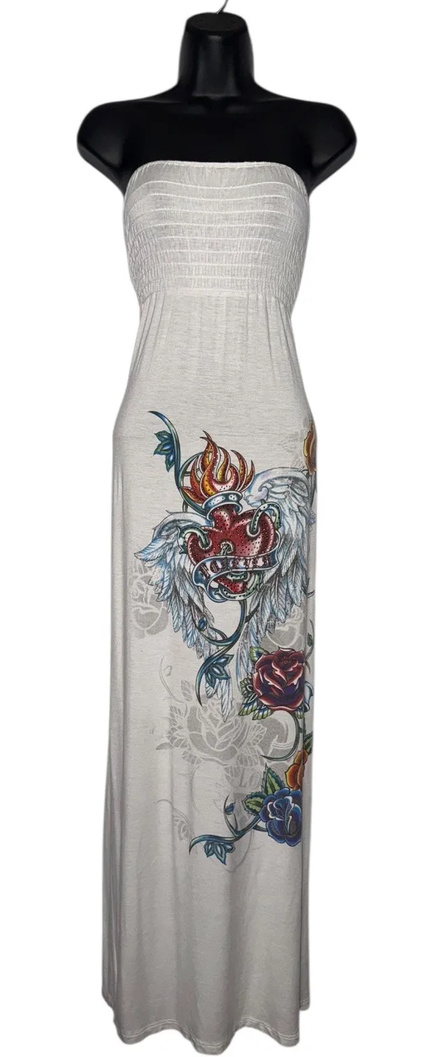 Y2K Tattoo Graphic Strapless Smocked Maxi Sun Dress Heart Roses Fire - $26 - From Rachelle