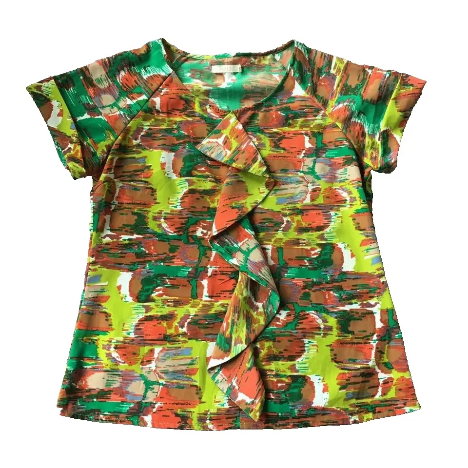 Tulle Y2K Top Women S 4 6 Mod African Print Ruffle Geo Tribal Green Orange Earth Tones Condition: Pre-owned - no stains, holes or issues noted. Please see all photos as they are part of the description. Brand: Tulle Style: Woven Pullover Blouse with Center Ruffle Placket Women's Size: Small / 4-6 Color: Green, Orange, White, Brown, etc. Print: Abstract Geometric / African Tribal Print Features: * Pullover * Short Sleeves * Center Ruffle Placket * Woven Polyester * Machine Wash * Made in China Measurements - are in inches, approximate & taken flat, unless otherwise noted Bust / Underarm to Underarm - 38" doubled Top Length - 24" total length - top of shoulder to bottom hem Smallest Waist - 35" doubled Hip/Hem - 39" doubled 4 oz