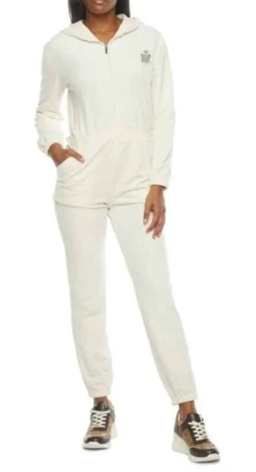 Stylish white jumpsuit with hood. Elastic cuffs and waistband. Comfortable and chic.