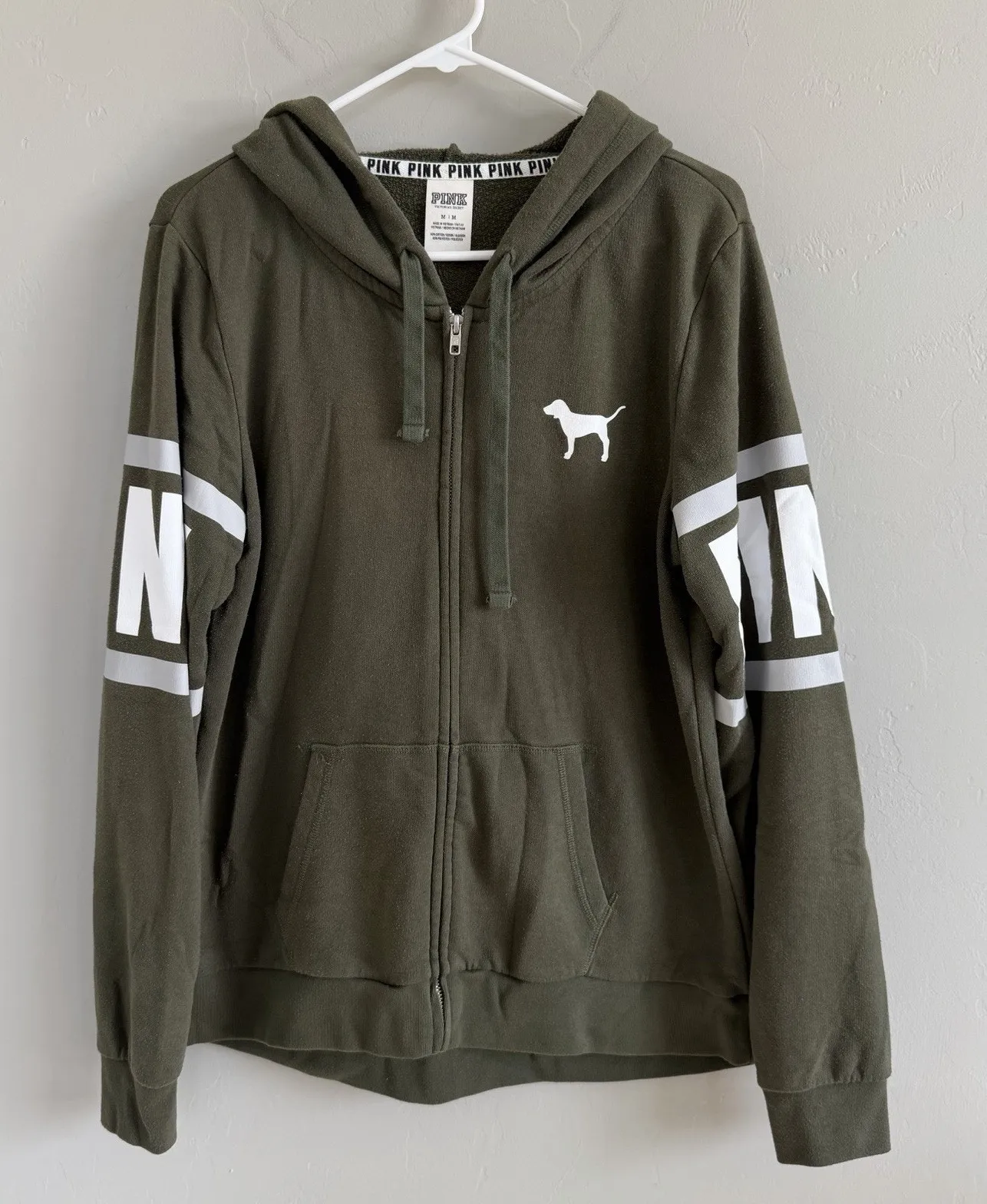 Good preowned condition, there is a moderate amount of pilling on the front of sweater, see photos. There are no major stains, holes, or other flaws. Woman’s size medium Olive / army green with white PINK and puppy decals Full zip up hoodie with pockets and drawstring