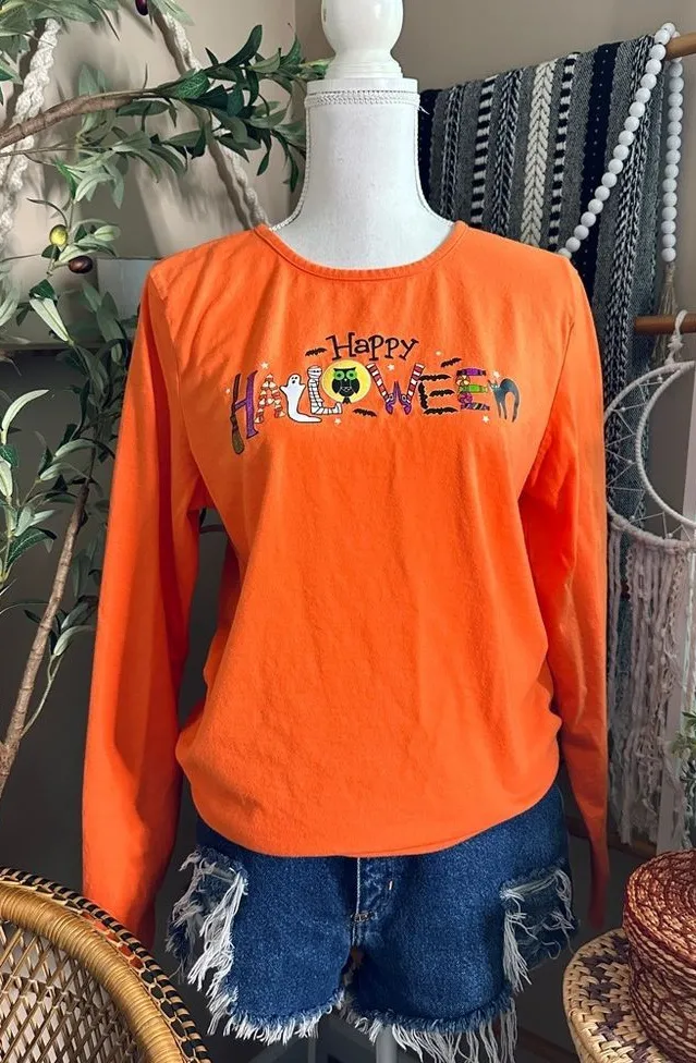 👻Y2K Vintage Holiday Editions Halloween Spell Out Graphic Long Sleeve Tee 🎃 Get into the spooky spirit with this retro Halloween long sleeve shirt! Features bold Halloween spell-out graphic across the front with fun festive lettering. Perfect for layering, cozy fall vibes, or your next Halloween party. ✨ Details: * Brand: Holiday Editions * Era: Y2K / early 2000s * Style: Spell Out Graphic Long Sleeve T-Shirt * Color: Orange with Halloween-themed print 📏 Size: XL 📐 Measurements lying flat Pit to pit 20.5” Length 26” In good gently used condition. There is a hand written star near brand/size on neckline as shown. #HolidayEditions #HalloweenTee #Y2KStyle #VintageGraphicTee #PoshmarkVintage