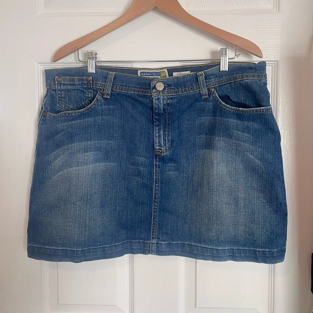 Y2K vintage jean skirt from Old Navy. Low rise. Medium blue wash. Embroidery detail on the back pock... Show more