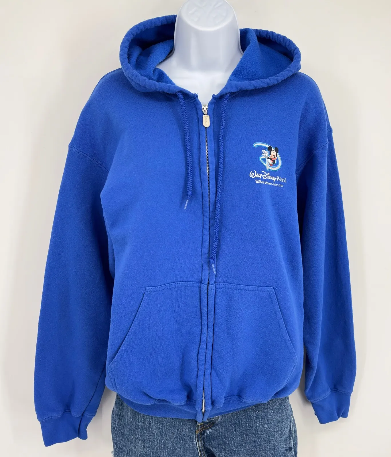 Y2K Walt Disney World blue zip-up hoodie sweatshirt featuring Mickey Mouse Goofy and Pluto graphic on the back. Front graphic displays Mickey Mouse with "Walt Disney World Where dreams come true". Full zip front closure with two front pockets and a hood with drawstrings. Ribbed cuffs and hem for a comfortable fit. This hoodie is perfect for any collector Disney fan. Size tag is faded, Please see photos for measurements and compare to an item you use now to assure fit: • Chest (pit to pit): 20 in • Length (shoulder to hem): 25 in Keywords: Disney, Mickey Mouse, Goofy, Pluto, Theme Park, Character, Graphic Hoodie, Unisex Disney, Casual Wear, Theme Park Attire, Travel, Vacation, Disney World Items are pre-owned unless otherwise noted and may show signs of previous use. Quick shipping in 1-2 business days.