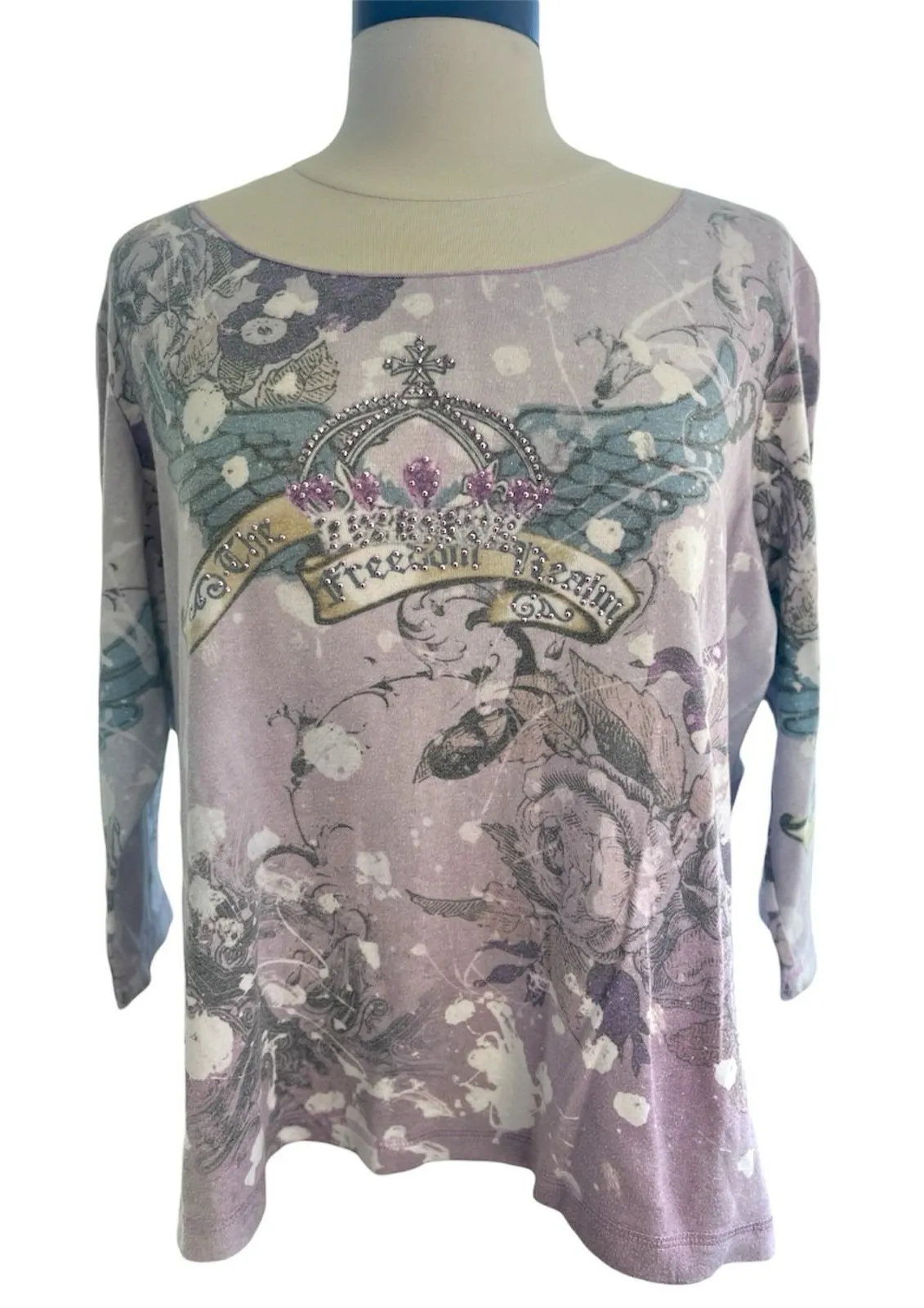 Y2K XCIT USA Freedom Realm Rhinestones Purple Top 1X Vampire Diaries Ed Hardy Brand: XCIT USA Size: 1X Color: Light Purple, Light Blue, white Fabric: 50% polyester 50% cotton Measurements: 24" Length 24" Pit to Pit Style: 3/4" sleeve, square neck, cropped, burnout wash, mineral wash, angel wing print, ed hardy type print, oversized cropped shirt XCIT, Vintage Y2K, vampire diaries, affliction core, pastel goth, 2000 mall goth, fairy grunge, biker babe, mc bling
