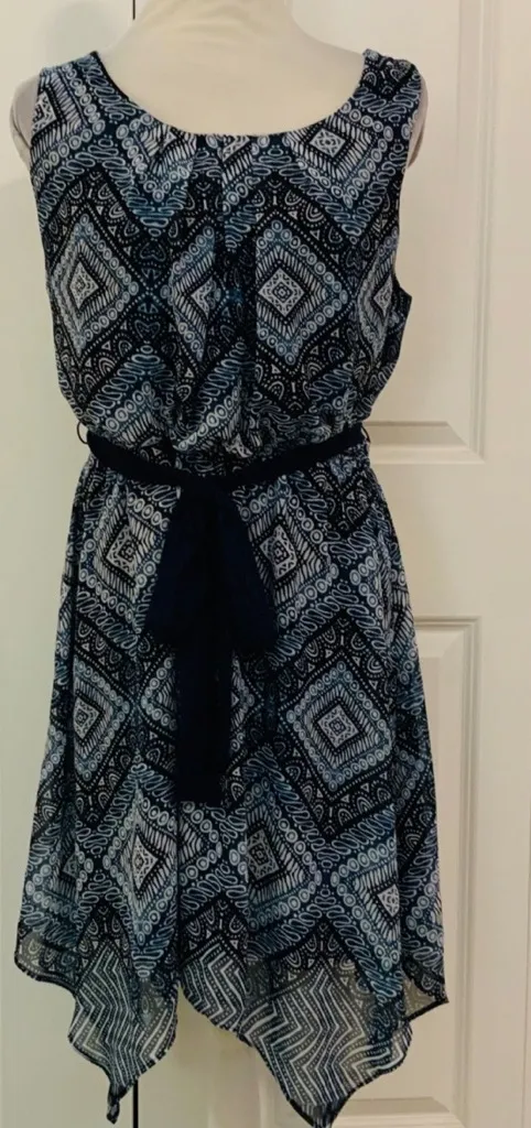 Size M Navy blue and white geometric print Sleeveless Round neckline Defined elastic waistband Removable belt Fully lined Handkerchief hem Pleated neckline 100 percent polyester PTP 19” Length 39” Knee length (depending on height) Excellent condition