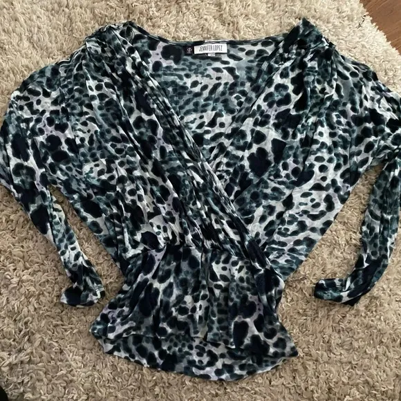 surplice bodice, fitted band waist. Colors are white, grayish blue & black.