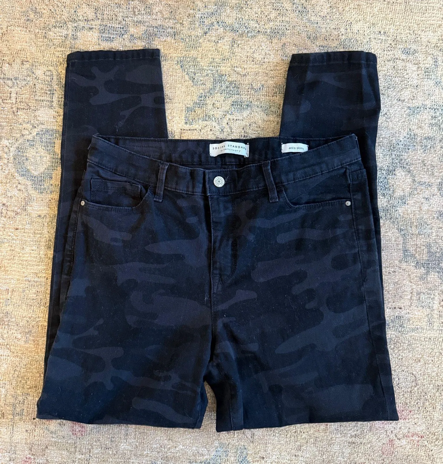 Chic black camo skinny jeans. Perfect for casual style. Comfortable and trendy. SIZE: 10 WAIST: 15... Show more