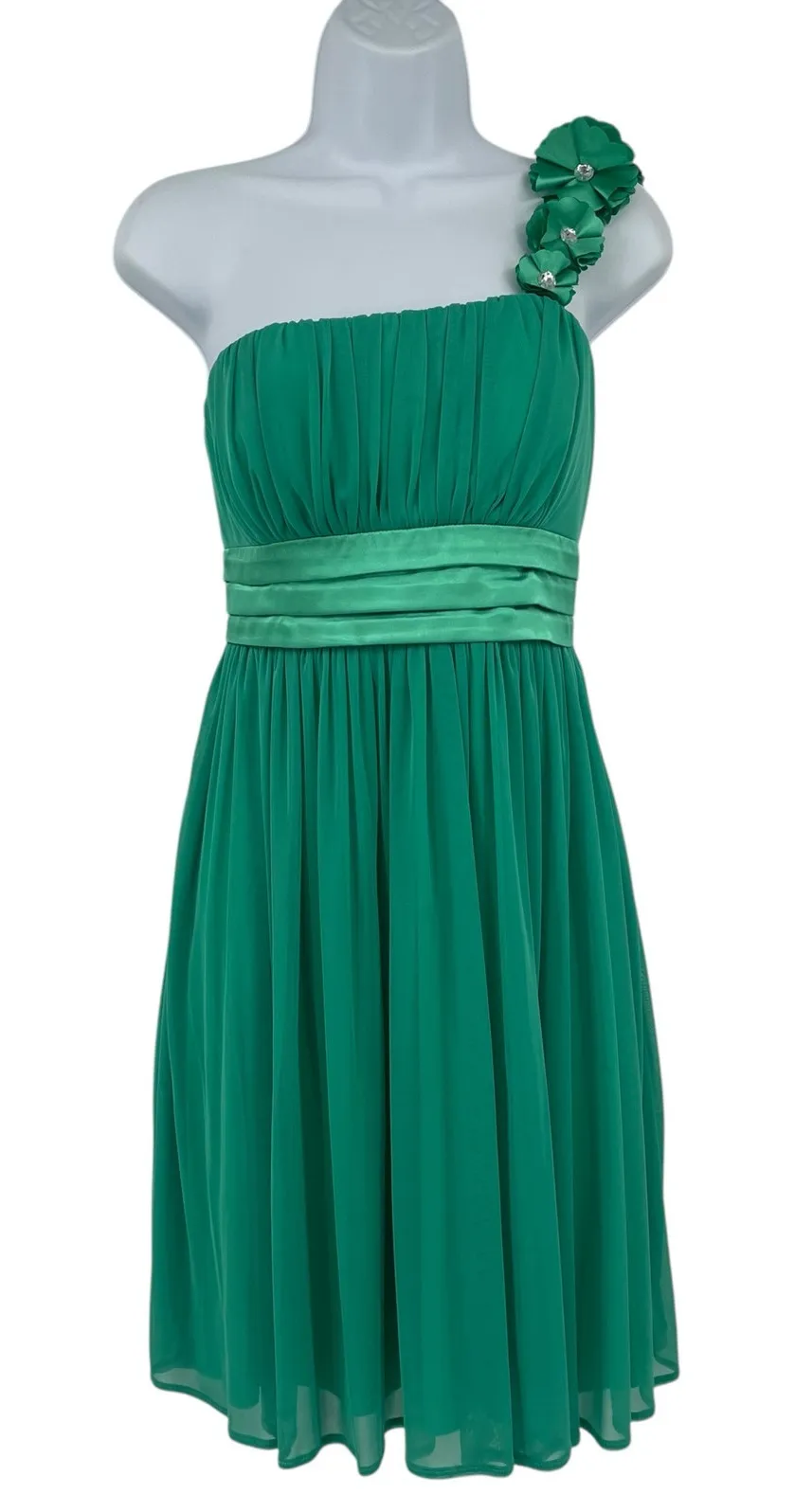 HoCo, Spring, Party, Milkmaid, Crystal, Pleats, Sash, Satin, Flower, Florette, Babydoll, One Shoulder, Sequin Hearts, green chiffon dress, one shoulder, bow back, party dress, prom dress, cocktail dress, bridesmaid dress, ruched bodice, floral strap, evening gown, junior formal, emerald green, romantic aesthetic, coquette, Y2K formal, homecoming, 2010s dress, sweet sixteen, spring wedding guest