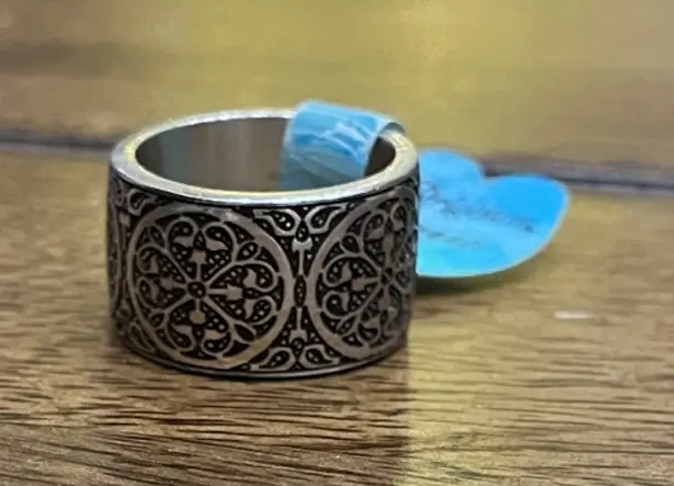 Elegant silver ring with intricate black patterns. Stylish and versatile.