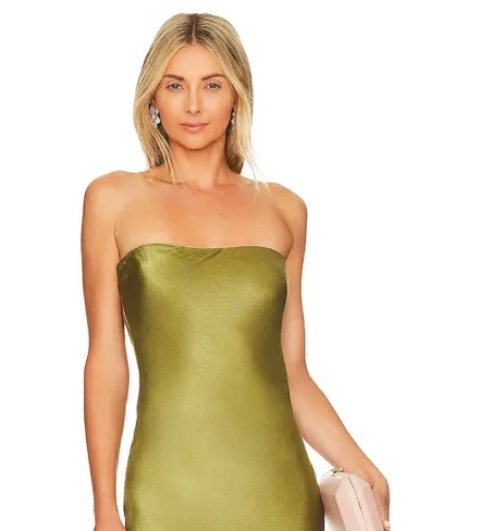 Elegant strapless midi dress. Sleek satin finish. Perfect for evening wear.
