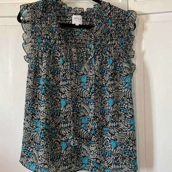 - Sleeelvess blouse with ruffle detail at the collar, shoulder, and edging. Rouched bodice offers some stretch and a cute tie at the V-neck lets you decide how much skin you prefer to show. Abstract floral/nature print. Perfect for work, a night out, or a day in the city. Lightweight and packable. Teal, black, white Designer Nature Flowy Tropical Relaxed Fit Boho BohoGlam Cottage Casual Business Casual Professional Ruffles Rouching