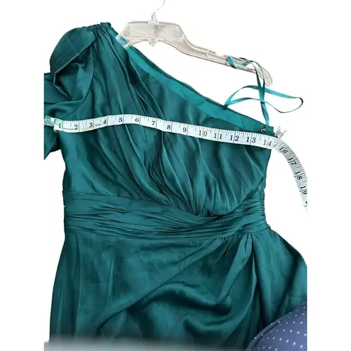 Satin one sleeved ruched cocktail dress with a cascading ruffle. Ieena for Mac Duggal Satin Charmeuse Fabric (100% polyester) Fully lined Asymmetrical neckline Single split long sleeve Ruched detailing on bodice and skirt Draped cascading ruffle Concealed side zipper Approx. 36" from top of shoulder to bottom hem Available in Emerald Green and White Style #55336 Size: 4 Color: Emerald green Please see pics for measurements.