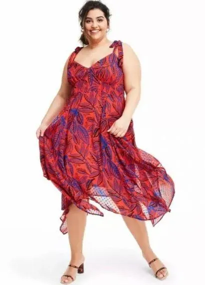 Alexis For Target Dress Tropical Leaf Tie Strap Asymmetrical Hem Size 2X Women’s Plus Orange, Blue, And Black Botanical Print Midi Side Zipper Adjustable Shoulder Ties Sleeveless V Neck Piping At The Bodice Smocked Back Wide Straps Lined Length 51 Inches Twill Tropical Print Machine Wash, Tumble Dry Fabric: 100% Polyester Lining: 95% Polyester/5% Spandex Made In China New With Tags. Tags have sticker residue and shelf wear Color appearance may vary depending on monitor.